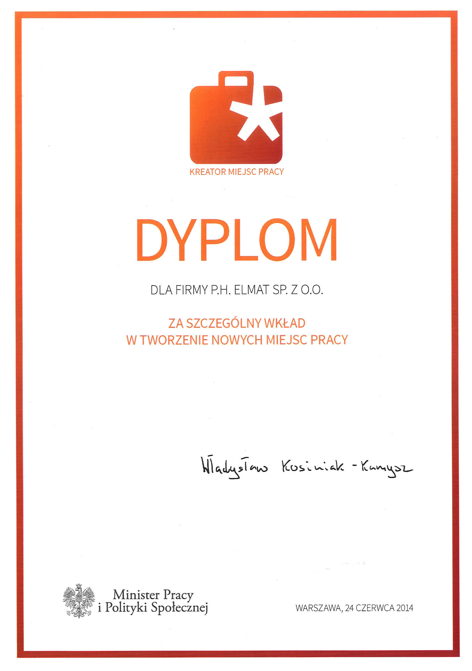 Dyplom dla naszej firmy, za szczególny wkład w tworzenie nowych miejsc pracy, przyznał Minister Pracy i Polityki Społecznej – Władysław Kosiniak-Kamysz.